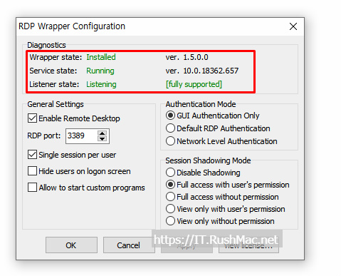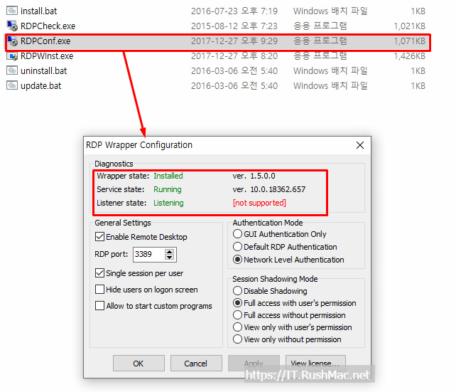 - RDPconf.exe 파일 실행 후 정상적으로 설치가 완료 되었는지 체크 하기 위해 실행 합니다.