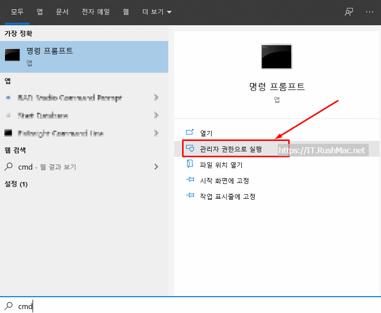 - cmd 관리자 권한으로 실행 하기