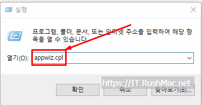 - 먼저 실행에서 [appwiz.cpl] 입력하여, 확인 합니다.