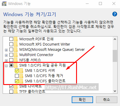 - [Windows 기능] 창이 실행되시면, SMB 1.0/CIFS파일 공유 지원 하위폴더 SMS 1.0/CIFS 서버, SMS 1.0/CIFS 클라이언트 체크 합니다. 확인 클릭합니다.