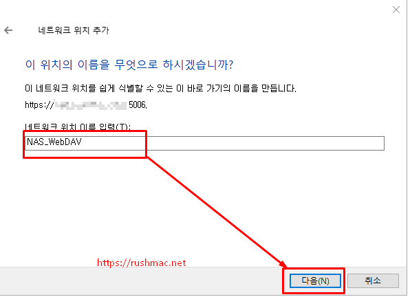 - 로그인 성공 시 다음과 같이 윈도우에서 사용될 네트워크 위치 이름 지정 후 다음 클릭 합니다.
