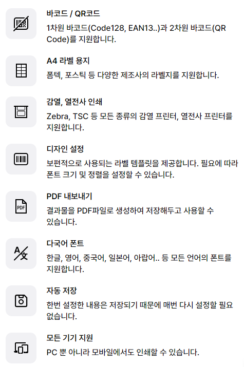 바코드 인쇄에 꼭 필요한 기능만 담아 바코드를 인쇄 할 수 있습니다