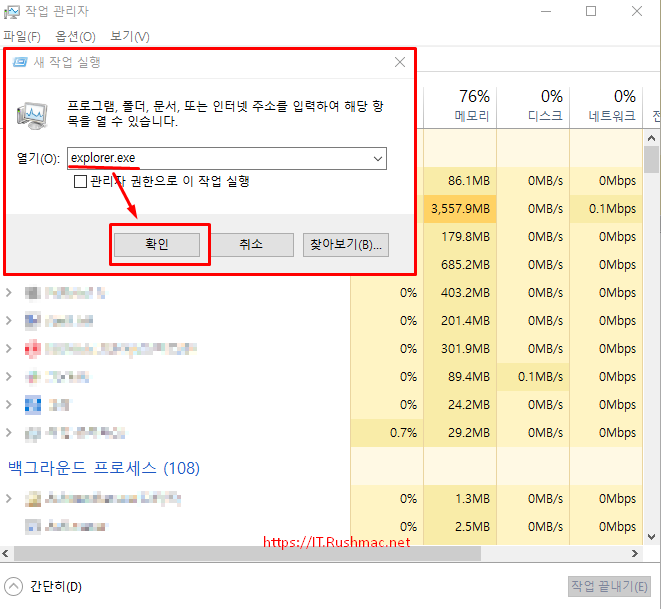 - 새 작업 실행창에서 "explorer.exe"를 입력 후 확인 버튼 클릭 하시면 됩니다.