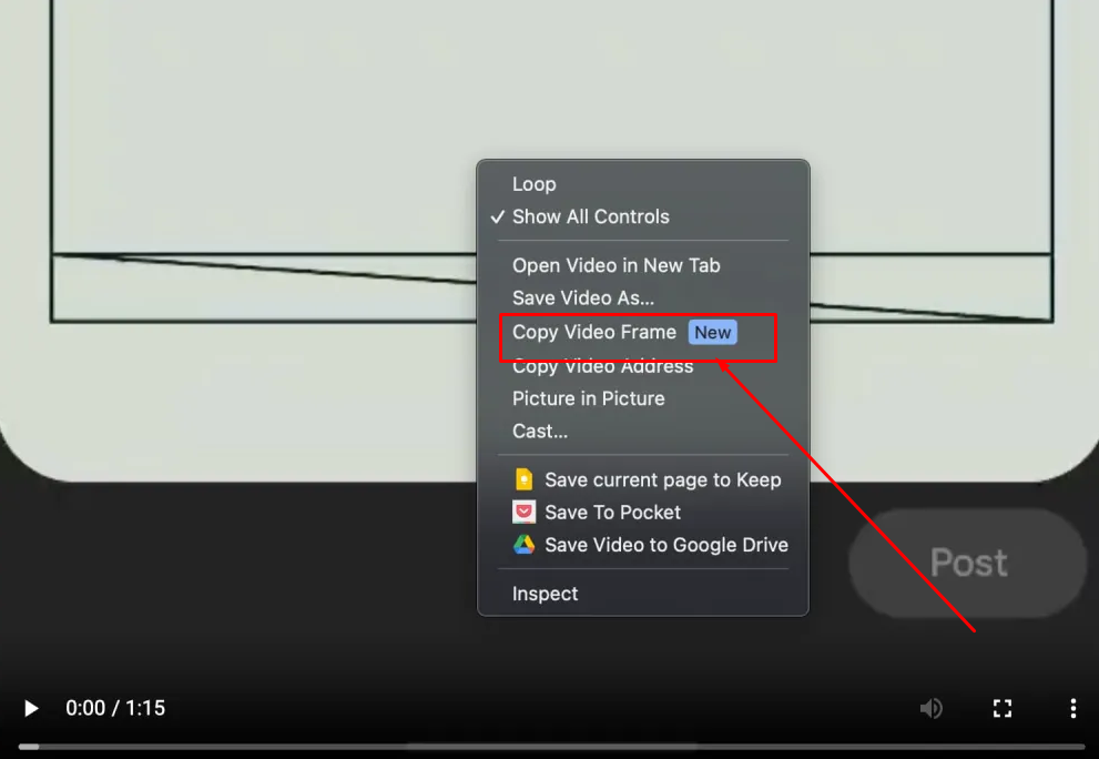 Chrome 116에서는 일시 중지된 비디오를 마우 오른쪽 버튼으로 클릭하면, 탭에서 열기 및 저장과 함께 새로운 "동영상 프레임 복사"옵션을 제공 됩니다. 이렇게 하면 현재 표시된 내용이 저장되고 크롬 내에서 지원되는 웹 텍스트 필드에 붙여 넣을 수 있습니다. 맥에서는 데스크탑에 붙여넣기가 불가능해서 아쉽습니다.