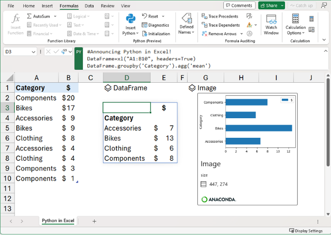 Anaconda는 데이터 실무자가 사용하는 선도적인 엔터프라이즈 Python 저장소이고, 협력해 별도의 설정이 필요 없는 Python in Excel 코드 실행을 지원합니다.