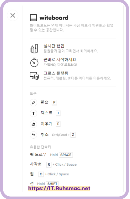 실시간 다른 사람들과 공유하고 간단하게 작업할 수 있고 사용방법이 쉽고, 공유 기능으로 즉시 화이트보드에 접속되면 편집할 수 있습니다. 그렇지만, 권한기능이 없어서 누구나 액세스 할 수 있는 단점인 것 같습니다.