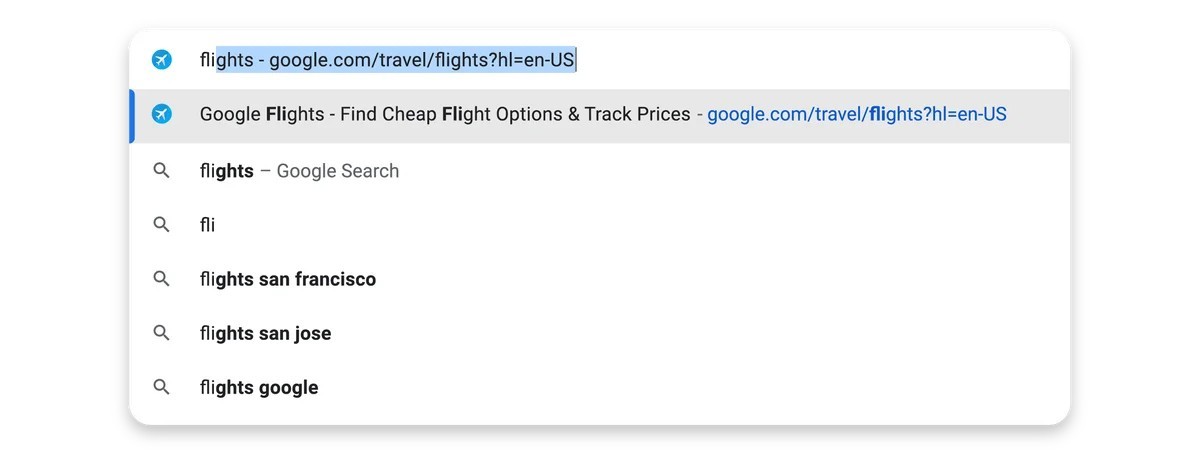 주소창에서 URL을 올바르게 입력했을 때만 주소창에 URL이 자동 완성되던 시대는 지났습니다. 최신 업데이트를 통해 Chrome의 주소창은 이전에 웹사이트를 검색할 때 사용한 모든 단어를 기반으로 URL을 자동 완성합니다. 예를 들어 '항공편'을 검색하여 Google 항공편으로 이동한 적이 있다면 다음에 '항공편'을 입력하면 Chrome이 Google 항공편 URL을 자동 완성 합니다.