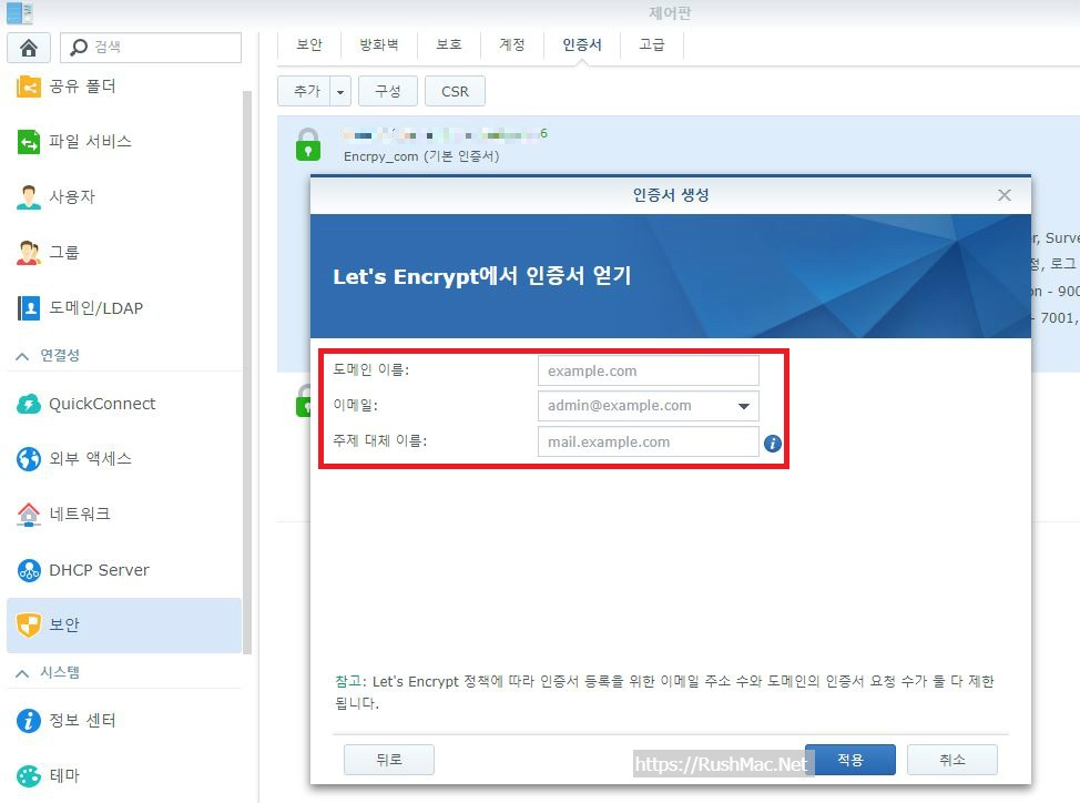 synology 구매한 도메인 대해 인증서(ssh) 등록 방법<let's encrypt 기관>