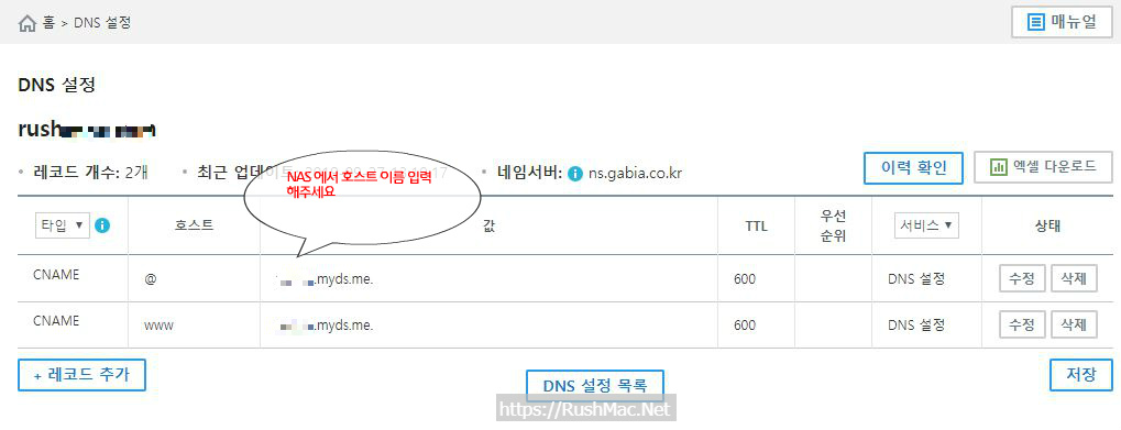 NAS 호스트 이름 -> CNAME레코드 값 필드에 등록 해줍니다.